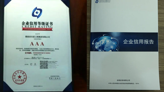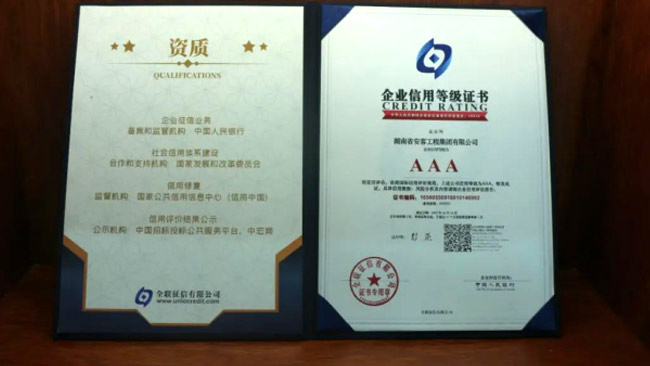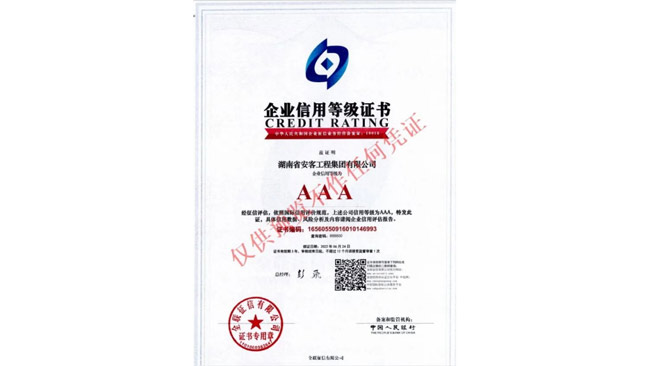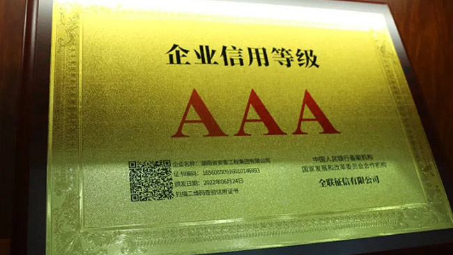 在今年的全國征信評定活動中,湖南省安客工程集團有限公司又一次脫穎而出,再度榮冠成為2022年度“企業(yè)信用等級3A”企業(yè),為集團品質(zhì)品牌升級邁向新的高度,凝聚更多力量,注入更多動能。
